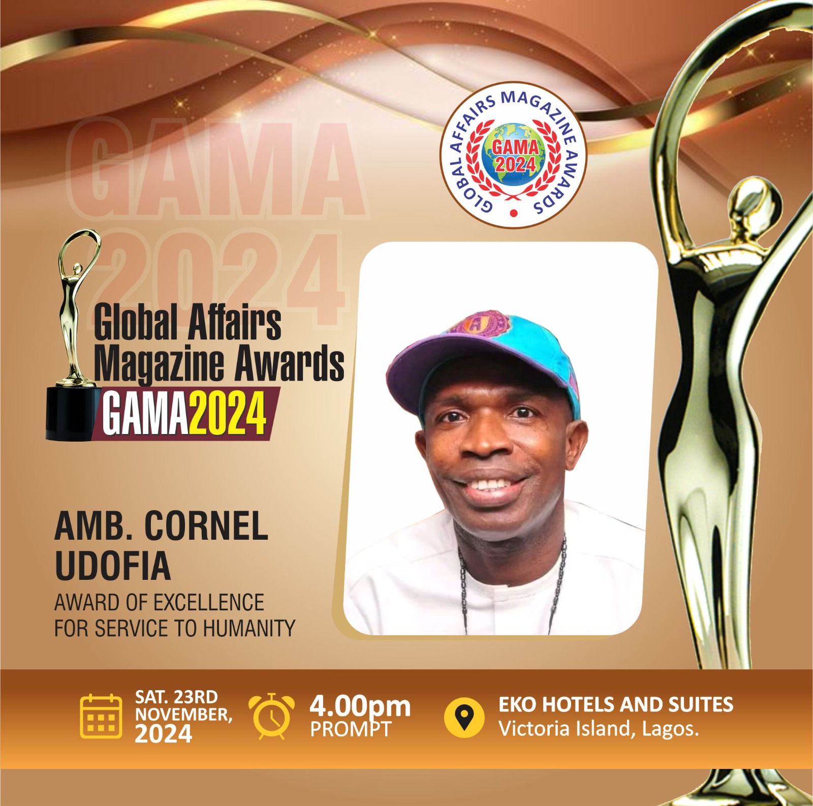 “To celebrate this milestone and to indeed set the Excellent Benchmark, GAMA is hosting you to top media recognition and ceremony at the prestigious Eko Hotel and Suites, Victoria Island, Lagos on Saturday 23rd November 2024 beginning with a red carpet at 4pm”.