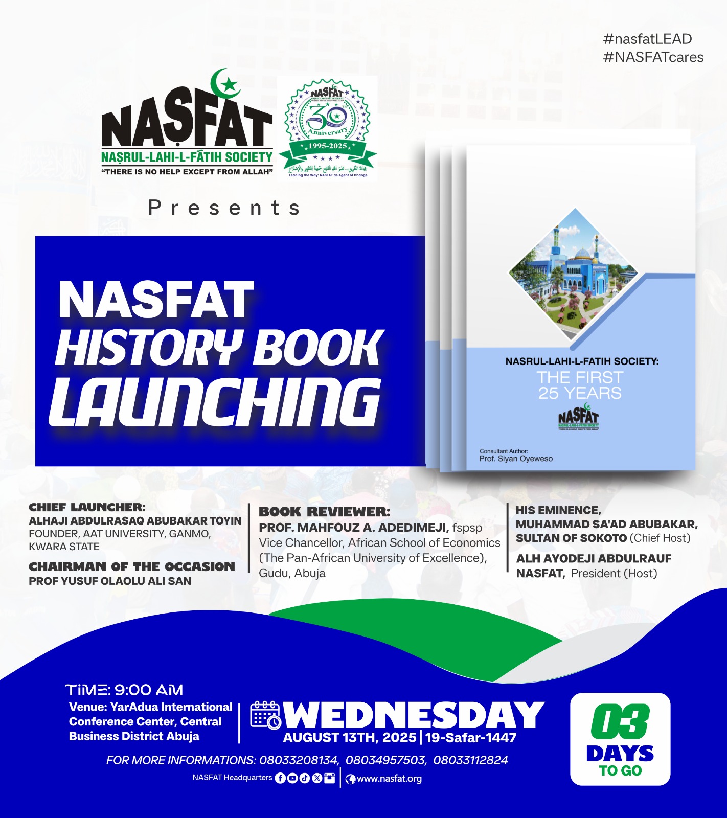 The Nasrul-Lahi-l-Fatih Society (NASFAT) is set to host its historic book launch on Wednesday, 13 August 2025, at the Yar’Adua International Conference Center, Central Business District, Abuja, and the event is expected to draw prominent Nigerians from various fields.