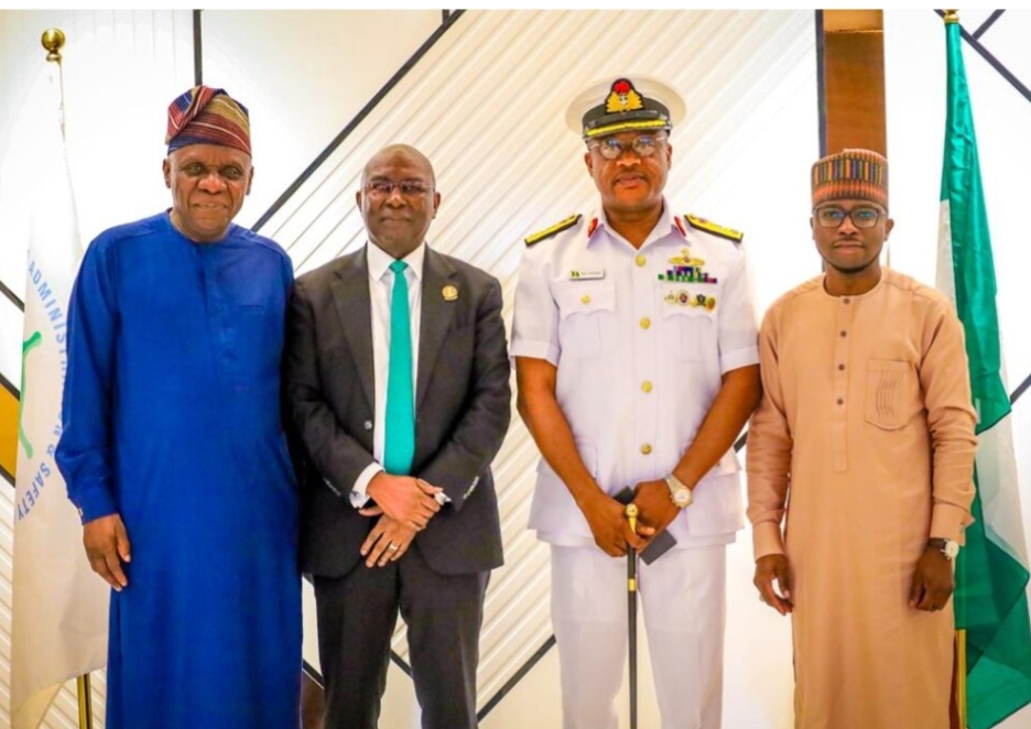 L-R: Executive Director, Operations, Nigerian Maritime Administration and Safety Agency, NIMASA, Engr Fatai Taiye Adeyemi; Director General, NIMASA, Dr. Dayo Mobereola; newly appointed Commander of the Maritime Guard Command at NIMASA, Commodore Adoki and Executive Director, Maritime Labour and Cabotage Services, NIMASA at the NIMASA headquarters in Lagos.