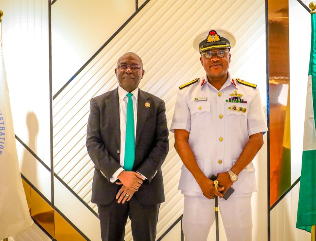 Director General, Nigerian Maritime Administration and Safety Agency, NIMASA, Dr Dayo Mobereola (left) and the newly appointed Commander of the Maritime Guard Command at NIMASA, Commodore Adoki at the NIMASA headquarters in Lagos.