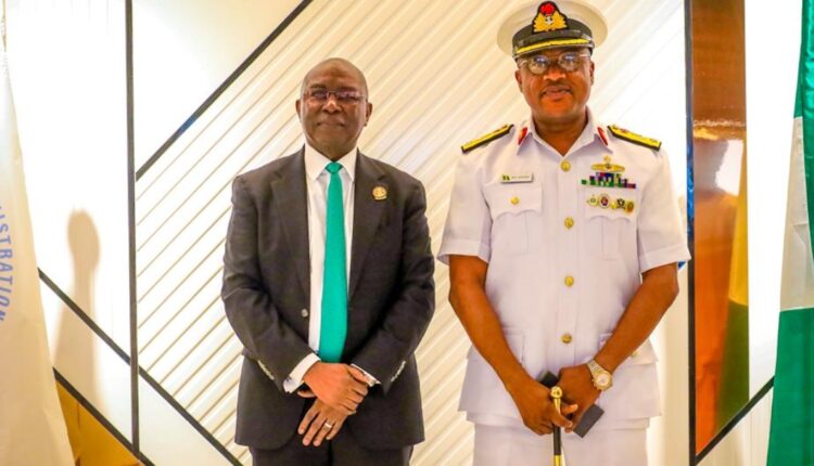 Director General, Nigerian Maritime Administration and Safety Agency, NIMASA, Dr Dayo Mobereola (left) and the newly appointed Commander of the Maritime Guard Command at NIMASA, Commodore Adoki at the NIMASA headquarters in Lagos.
