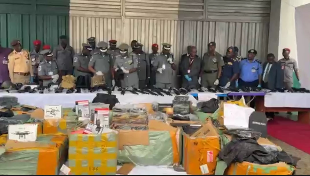 The breakdown of the seizures is 148pcs of Drones; 172pcs of Ballistic Vest; 15pcs of Ballistic Plate; 1pc of Ballistic Helmet; 8pcs of Talkie Talkie; 9,172pcs of Military &Paramilitary Badges; 20pcs of Camouflage Uniform; 100pcs of Camouflage Vest; 172pcs of Camouflage Cap; 120pcs of Binoculars; and the total Duty Paid Value of all the displayed items is One Billion Five Hundred and Sixty-Eight Million Nine Hundred and Seven Thousand Three Hundred and Eighty-Six Naira and 48 Kobo (N1,568,907,386.48) only.