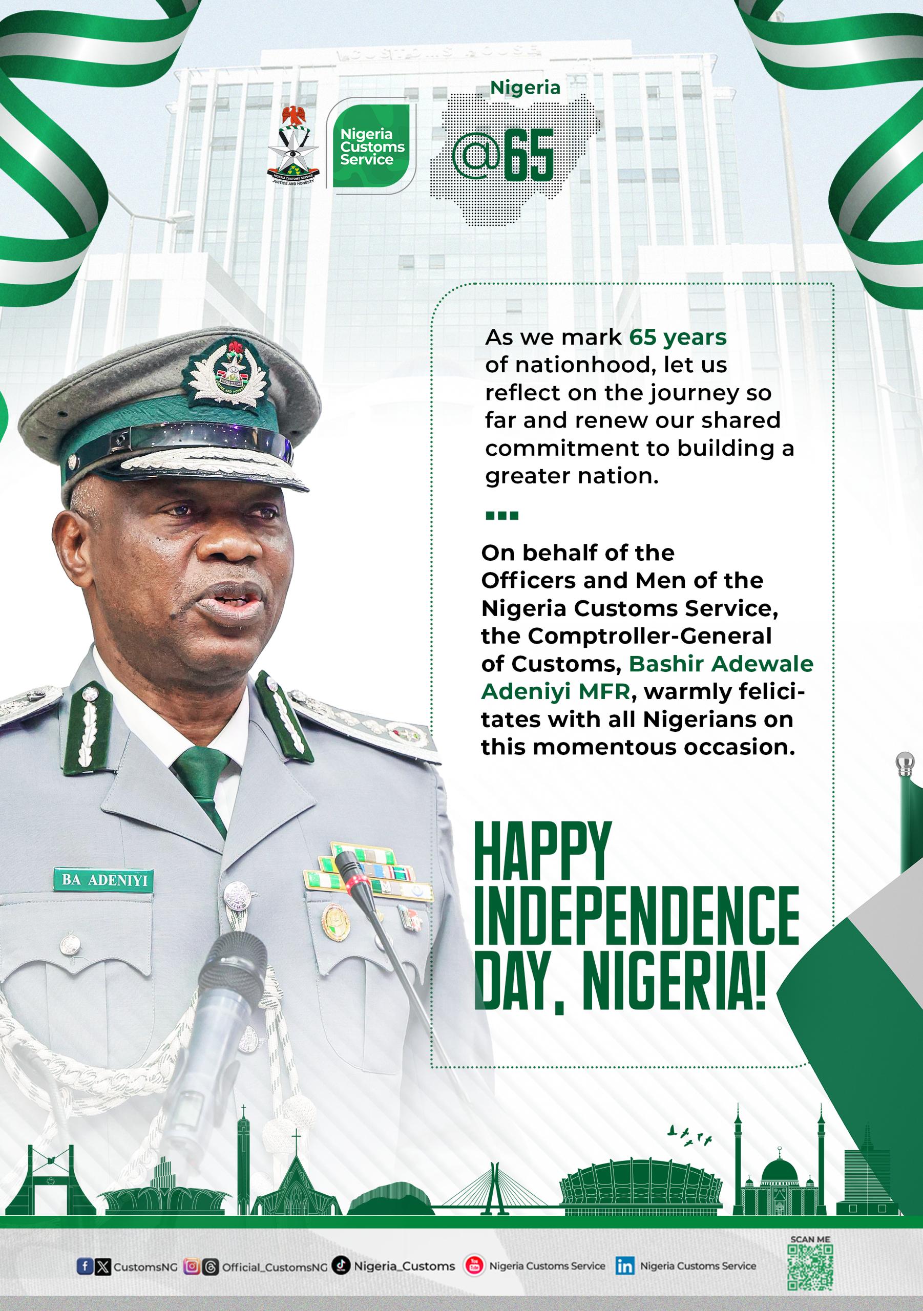 As Nigeria celebrated its 65th independence anniversary on 1 October 2025 with renewed hope, the Comptroller General of Customs Bashir Adewale Adeniyi MFR has joined other prominent leaders in the Country to felicitate with the citizens and called for a renew shared commitment to building a greater nation.