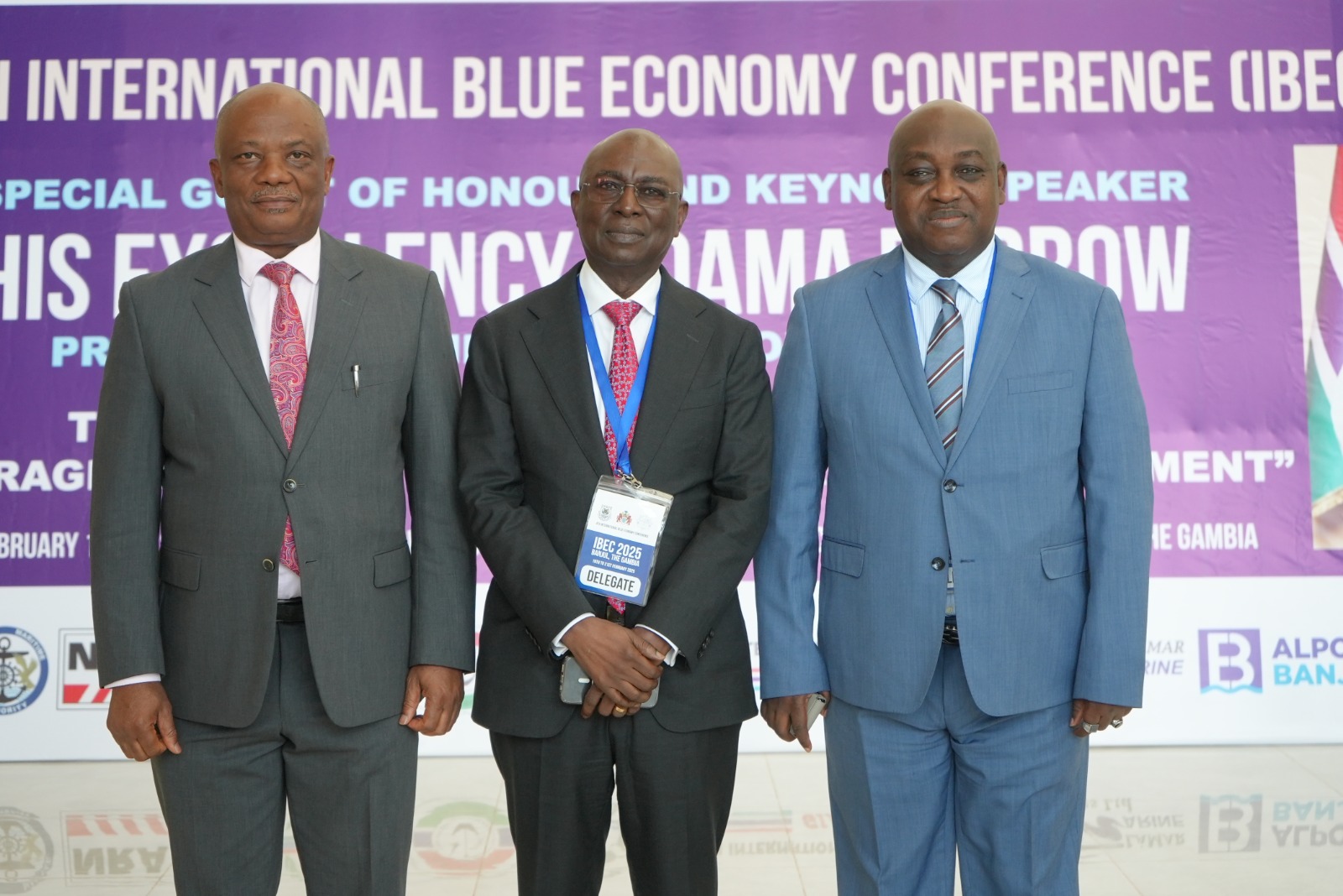L-R: Secretary General, Abuja MoU, Captain Sunday Umoren; Director General, Nigerian Maritime Administration and Safety Agency, NIMASA, Dr. Dayo Mobereola and Director, Maritime Safety and Security, Federal Ministry of Marine and Blue Economy, Babatunde Bombata during the 4th International Blue Economy Conference in Gambia.