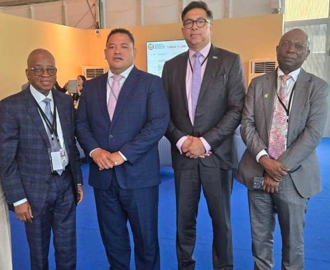 L-R: Nigeria’s Minister of Marine and Blue Economy, His Excellency Adegboyega Oyetola CON; Minister of Home Affairs, Climate Change and Environment of Tuvalu, Dr. Maina Vakafua Talia; Tuvalu’s Special Envoy on Oceans, Climate Change and the Commonwealth, Ambassador Shivshankar Nair and the Director General, Nigerian Maritime Administration and Safety Agency (NIMASA), Dr. Dayo Mobereola, when Oyetola met with the Tuvaluan Minister on the sidelines of the recently concluded 2025 United Nations Ocean Conference in Nice, France.