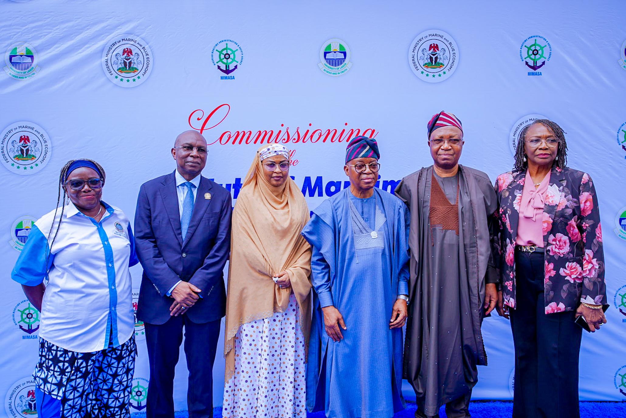 L-R: Pro-Chancellor and Chairman of the Governing Council of the University of Lagos (UNILAG), Chief Wole Olanipekun, SAN; Vice Chancellor of the University, Professor Folasade Ogunsola; Minister of Marine and Blue Economy, Dr. Adegboyega Oyetola, CON; Permanent Secretary, Federal Ministry of Marine and Blue Economy, Mrs Fatima Mahmood and the Director-General, Nigerian Maritime Administration and Safety Agency (NIMASA), Dr. Dayo Mobereola, when Oyetola commissioned the UNILAG Institute of Maritime Studies Multipurpose Building, donated by NIMASA, in Lagos, on Thursday.